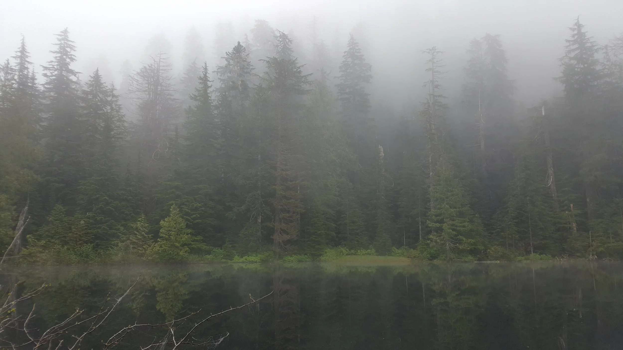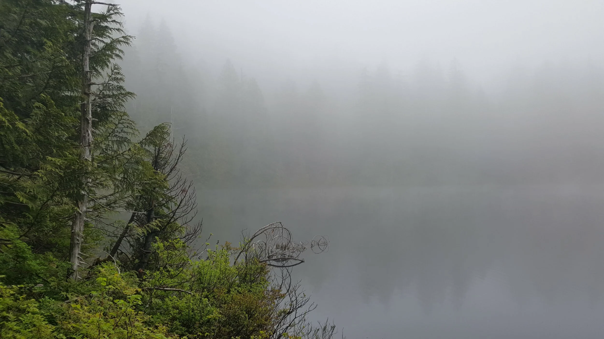 A little ways on we decided to picnic on a little logged section on the edge of the water. As we ate our noon time lunch, we watched the fog slowly lift to reveal the dark forestry behind and the smooth unrippled water below. And then just a distracted observation later, it would come back, dense and formidable.